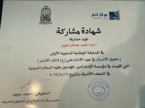 شارك معاون العميد للشؤون العلمية والطلبة والدراسات العليا الاستاذ المساعد الدكتور احمد عدنان عزيز في المسابقة الوطنية الاولى حول (حقوق الانسان في عهد الامام علي عليه السلام لمالك الاشتر) التي اقامها مركز ادم للدفاع عن الحقوق والحريات بالتعاون مع مؤسسة امير المؤمنين (ع) في مدينة النجف الاشرف حيث اختير بحثه ضمن البحوث الفائزة الخمسة في المسابقة وذلك يوم السبت الموافق 16/4/2022 .