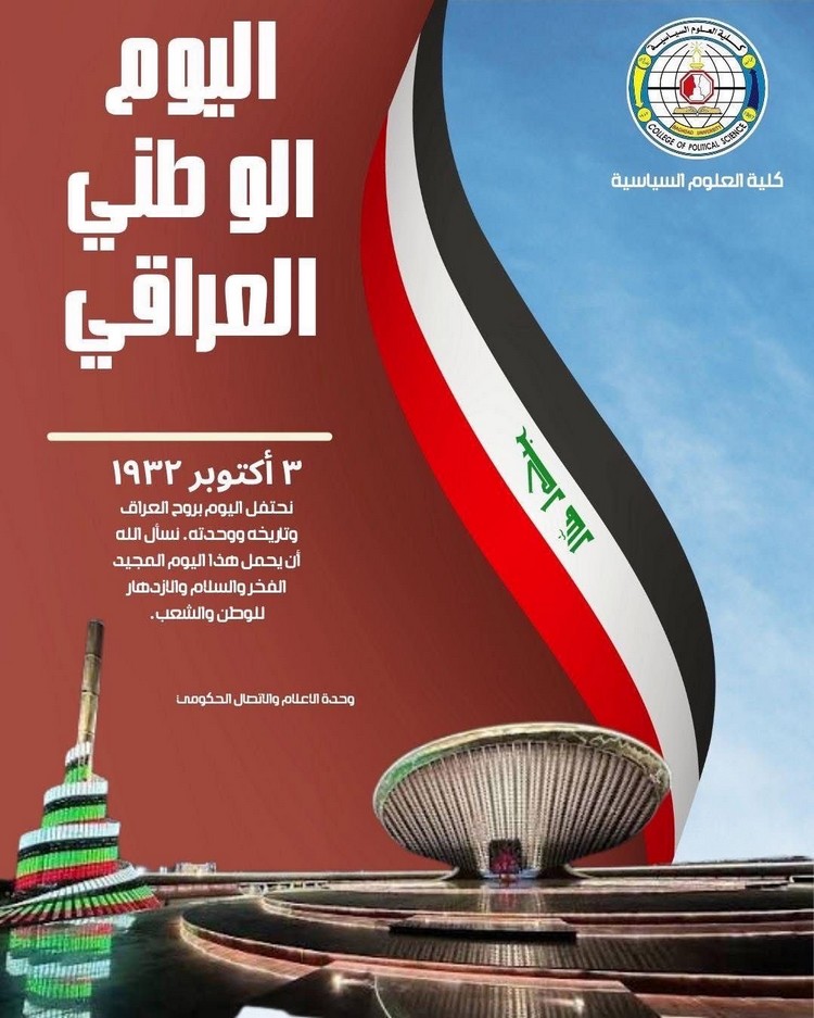 تؤكد كلية العلوم السياسية – جامعة بغداد في اليوم الوطني العراقي رسالتها الأكاديمية والوطنية القائمة على تعزيز قيم الانتماء والمواطنة، وترسيخ مبادئ الوحدة والتكاتف بين أبناء الشعب.